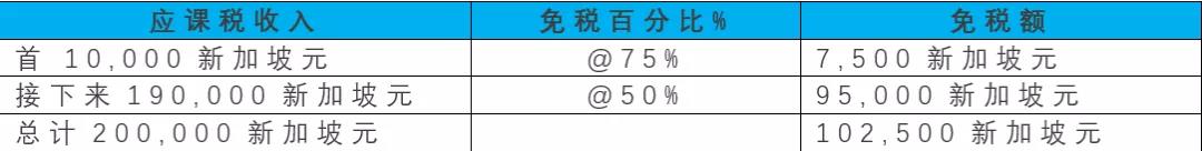 1.第一個10萬新幣應稅收入中的7.5萬是免稅的;