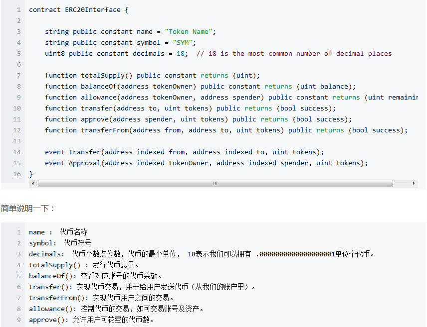 這里也介紹一下ERC20,這是以太坊定義的令牌標準。這個標準要求我們在實現代幣時必須遵守約定。只有支持協議,才能得到以太坊錢包的支持。下面是協議代碼界面??床欢矝]關系。程序員就能搞定。